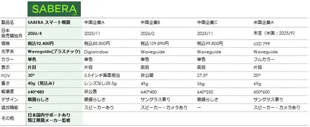 一般消費者向け AR グラスは、海外 メーカー を中心に 製品展開が進んでおります 。 一方で、国内に おける 同市場は未成熟であり、当社が先行する形で市場参入を行っています。 各社製品においては、 用途や設計思想に違いが 見られる中 、 SABERA は日常利用を前提とした設計思想のもと、光学技術・ 装着性・ UX 設計のバランスを重視したプロダクトとして開発を進めています。