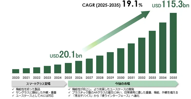 Ray-Ban Meta をはじめとするスマートグラスの普及を契機に、眼鏡型デバイス市場は世界的に普及 フェーズが急速に進展し、 2026 年以降は AR グラス 市場の本格的な拡大が見込まれています。 Future Market Insights 社の調査によると、 AR グラス 市場は 2025 年から 2035 年にかけて年平均成長率 19.1% で拡大し、 2035 年には市場規模 1,153 億米ドルへ拡大するとの予測が示されており、情報取得の主要 インターフェースがスマートフォンから眼鏡型デバイスへ移行する転換点にあ ると考えます 。