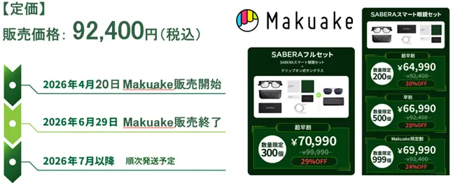 SABERA は、 まずはクラウドファンディングサービス「 Makuake」にて先行販売を予定しています。 その後、 2026 年 7 月以降、 自社 EC サイト およ び販売代理店を中心に 本格販売を予定しています。