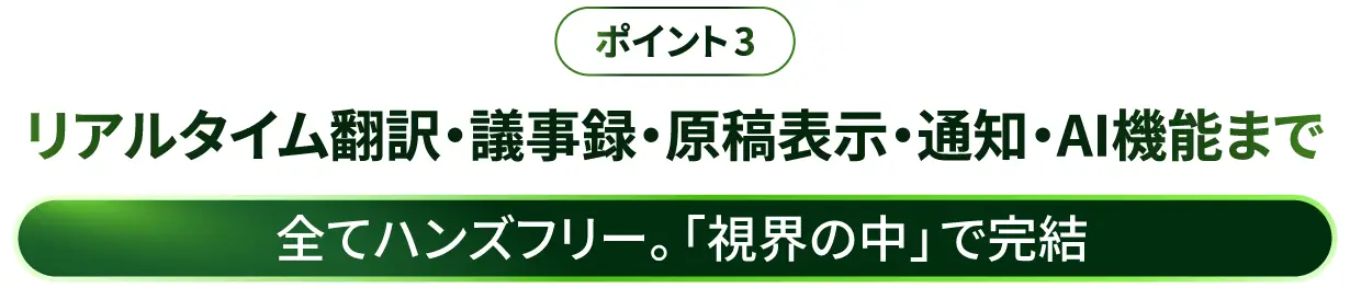SABERA は、一見すると通常の眼鏡と変わらないデザインでありながら、視界内に情報を表示するディスプレイを搭載したスマート眼鏡です。当社が目指すのは、単なる情報表示デバイスではなく、SABERA を身につければ、利用者のパフォーマンスを最大限引き上げ、大切な人とのつながりから、ビジネスの会話まで、重要な場面においても、その場に集中できる体験を提供します。